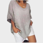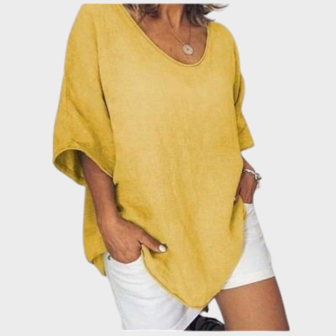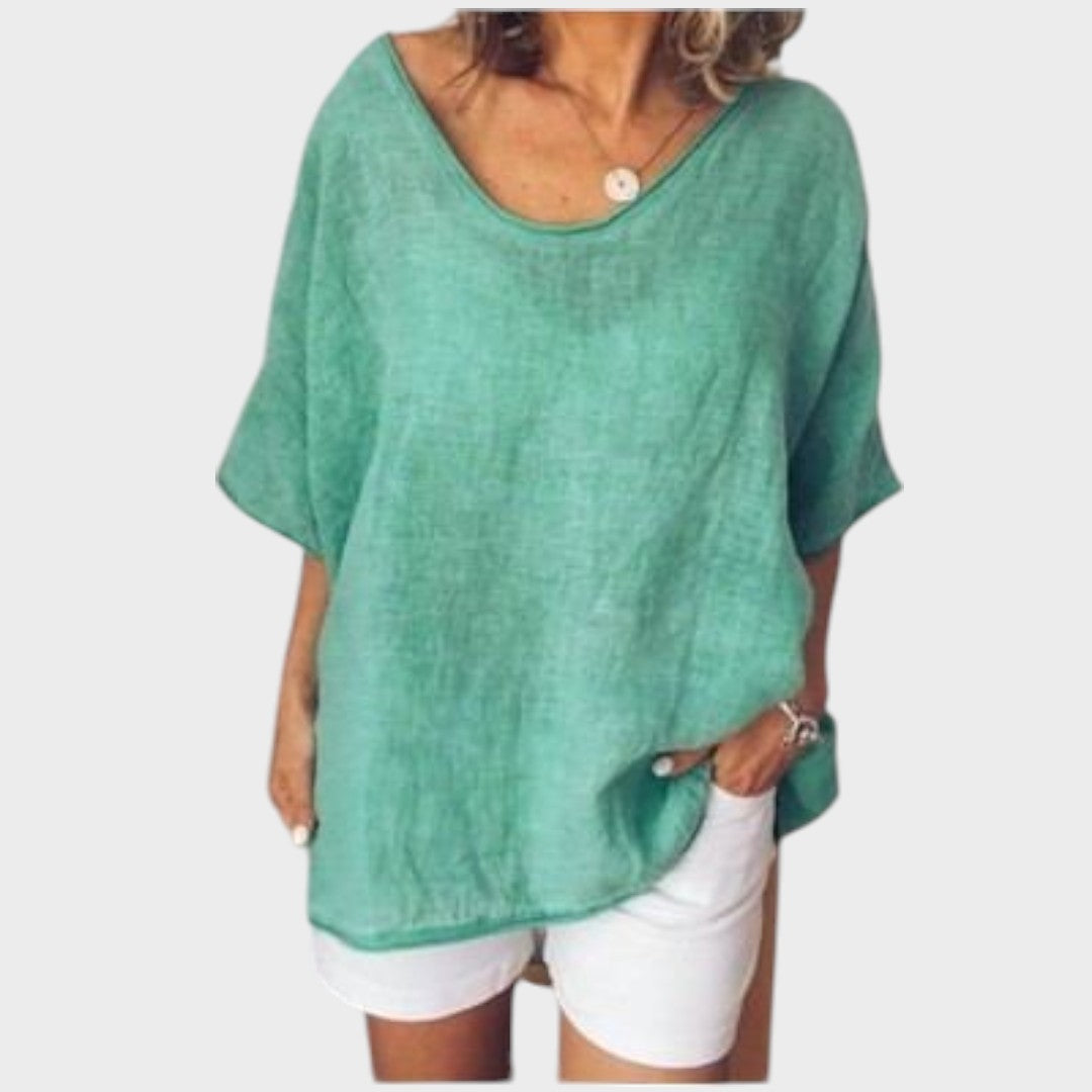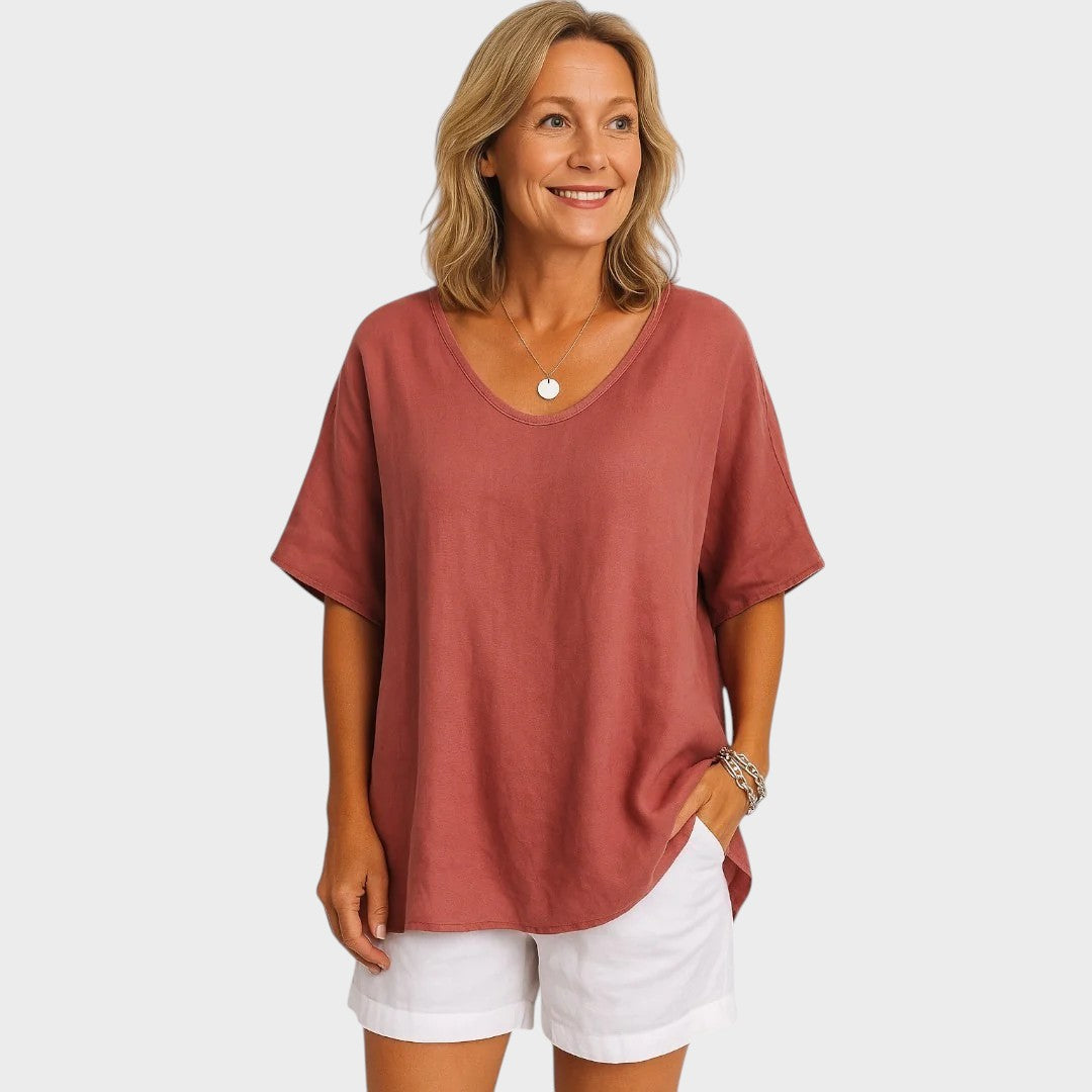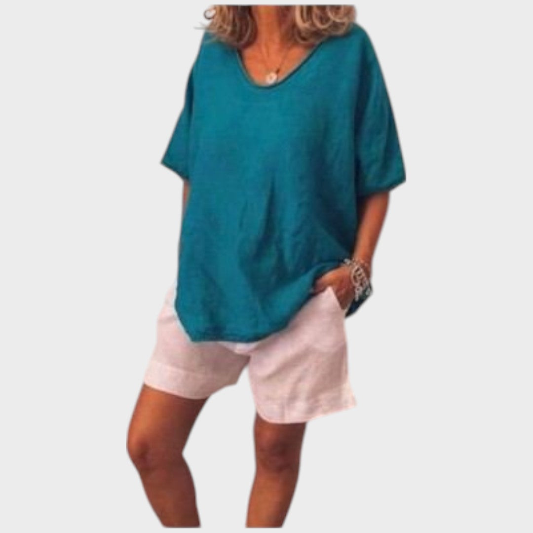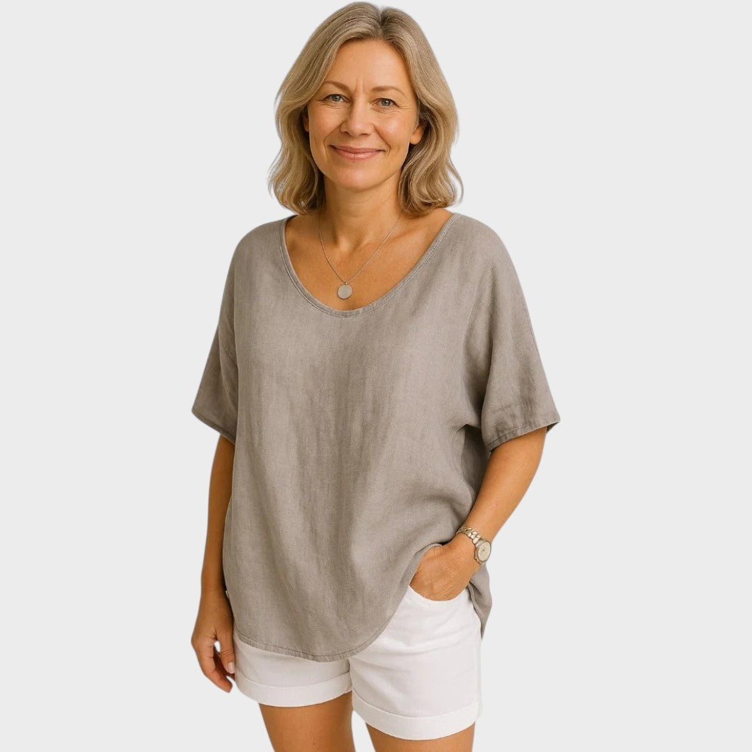 Grace es ese jersey básico que marca la diferencia en tu armario. Con un corte holgado y cómodo, cuello redondo y mangas cortas, es el jersey ideal para los días relajados sin renunciar al estilo. Confeccionado en un tejido suave y transpirable, se adapta al cuerpo con ligereza y suavidad.