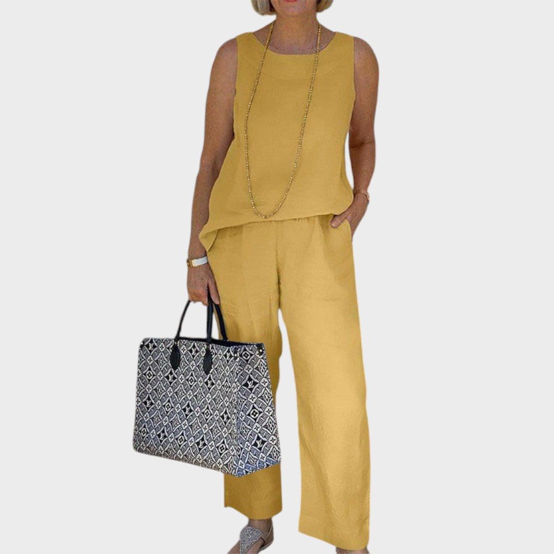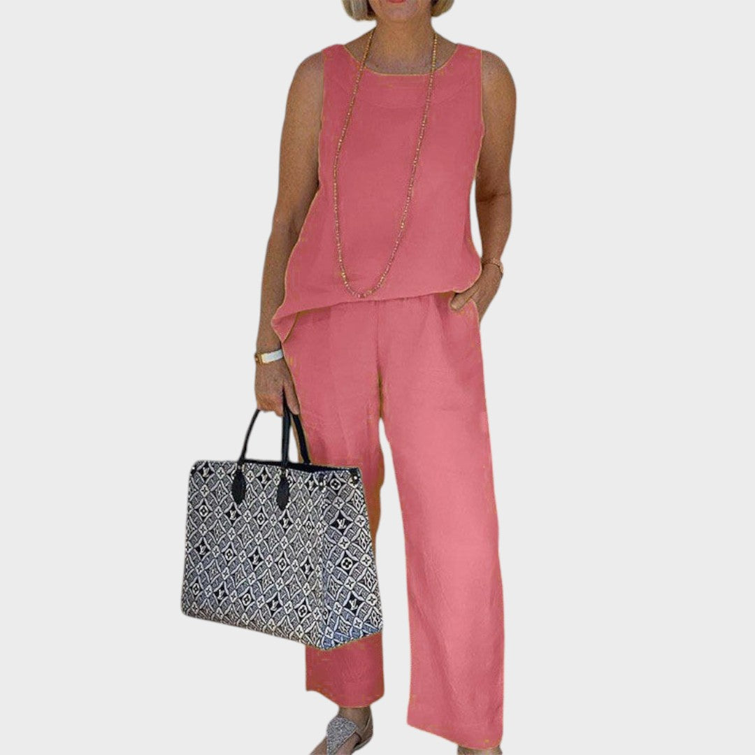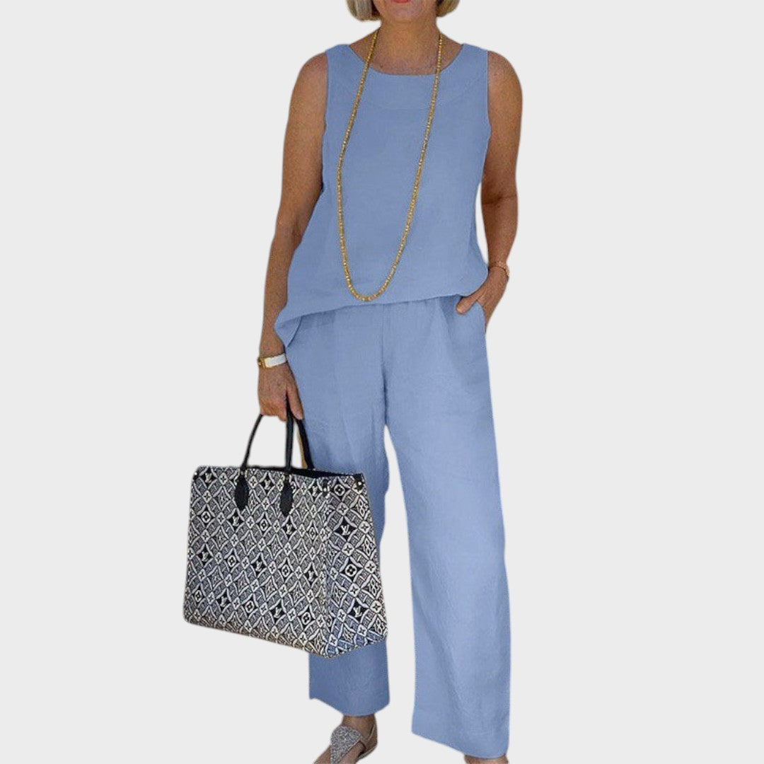 Valéa combina frescura y sencillez en un conjunto ideal para los días más cálidos. El top sin mangas y los pantalones fluidos crean una silueta ligera, mientras que el suave tejido proporciona libertad de movimientos y comodidad durante todo el día. Un básico veraniego para quienes valoran la elegancia sin complicaciones.