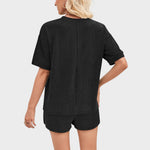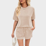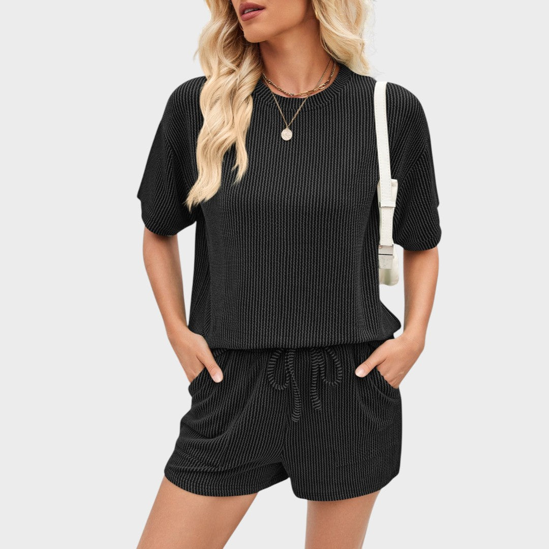 El conjunto Esmeralda presenta tonos vibrantes con textura acanalada, compuesto por una camiseta de manga corta y un pantalón corto con cordón ajustable. El tejido suave proporciona comodidad y ligereza, ideal para días calurosos o tiempo libre. El diseño contemporáneo y el corte casual realzan cualquier estilo, permitiendo combinaciones versátiles. Perfecto para quienes buscan un look casual con un toque moderno.